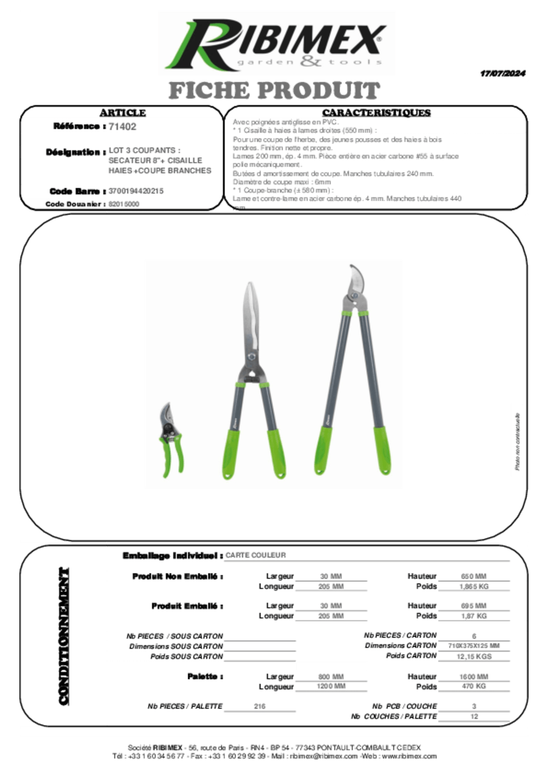 Lot de 3 coupants avec poignées antiglisse en PVC. - 1 Cisaille à haies à lames droites (550 mm). Lames : 200 mm, épaisseur : 4 mm. Pièce entière en acier carbone #55 à surface polie mécaniquement. Butées d amortissement de coupe. Manches tubulaires : 240 mm. Diamètre de coupe maxi : 6mm. - 1 Coupe-branche (± 580 mm). Lame et contre-lame en acier carbone épaisseur : 4 mm. Manches tubulaires : 440 mm. Lame en acier carbone traité HRC 50-54. Diamètre de coupe maxi : 22mm. - 1 Sécateur 8". Lames courbes en acier carbone. Système de blocage en position