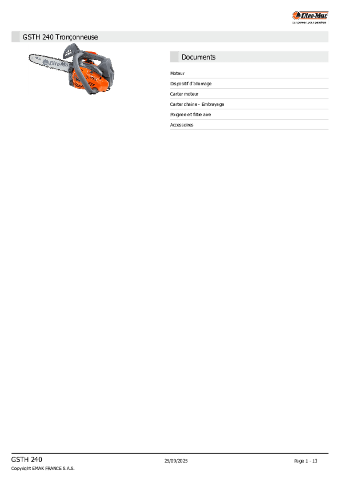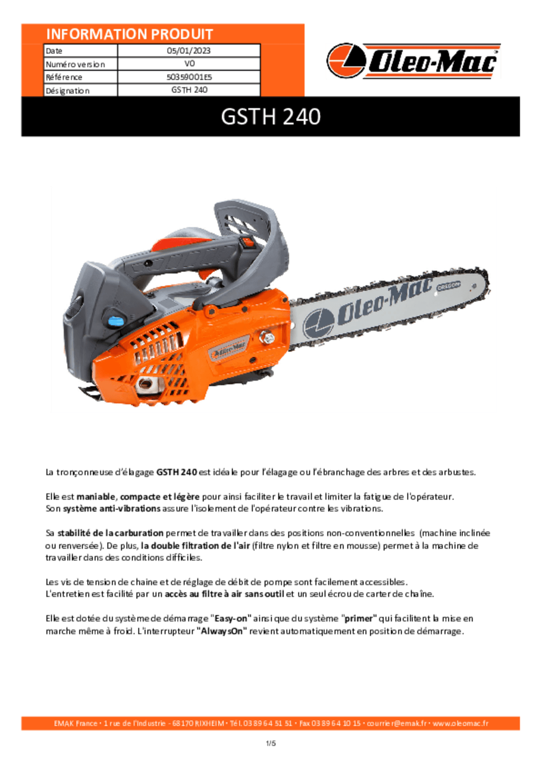 Elagueuse thermique. GSTH 240. Moteur Emak. Cylindrée 25,4 cc. 1 cylindre 2 temps EURO 2. Puissance 0,9 kW, 9000 tr/min. Démarrage par lanceur Easy-On. Système Primer pour démarrage à froid. Systéme de refroidissement à air. Système anti-vibrations. Embrayage centrifuge, 2 pièces. Carburant : mélange 2% huile type ISO-L-EGD. Capacité du réservoir 0,20 L. Guide 25 cm. Chaine (pas x jauge x nbre de maillons) - 3/8"x 0,050''-1,3 x 40. Vitesse de chaîne 22,9 m/s à 12500 tr/min. Réservoir d'huile de chaine 0,21 L. Poid 3,2 Kg.