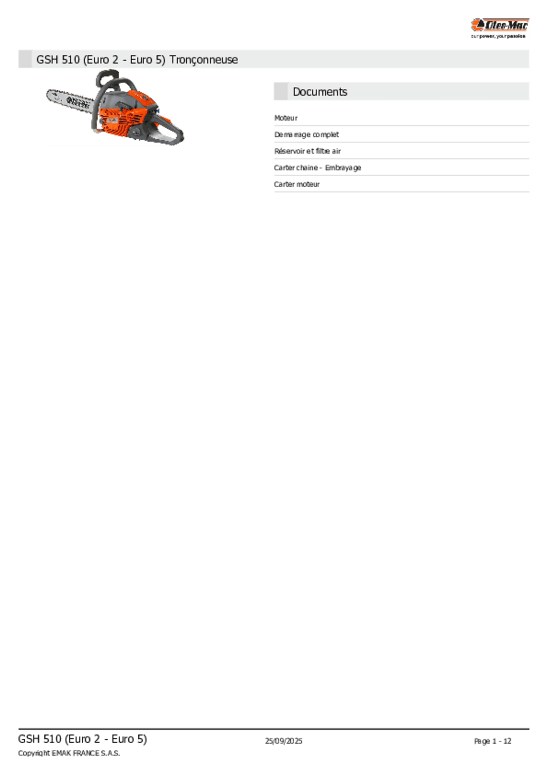 2T. 54,5 cc. 2,6 kW/3,5 ch. 51 cm. Chaine 0,325'' x 0.058''. Tendeur de chaine latéral.