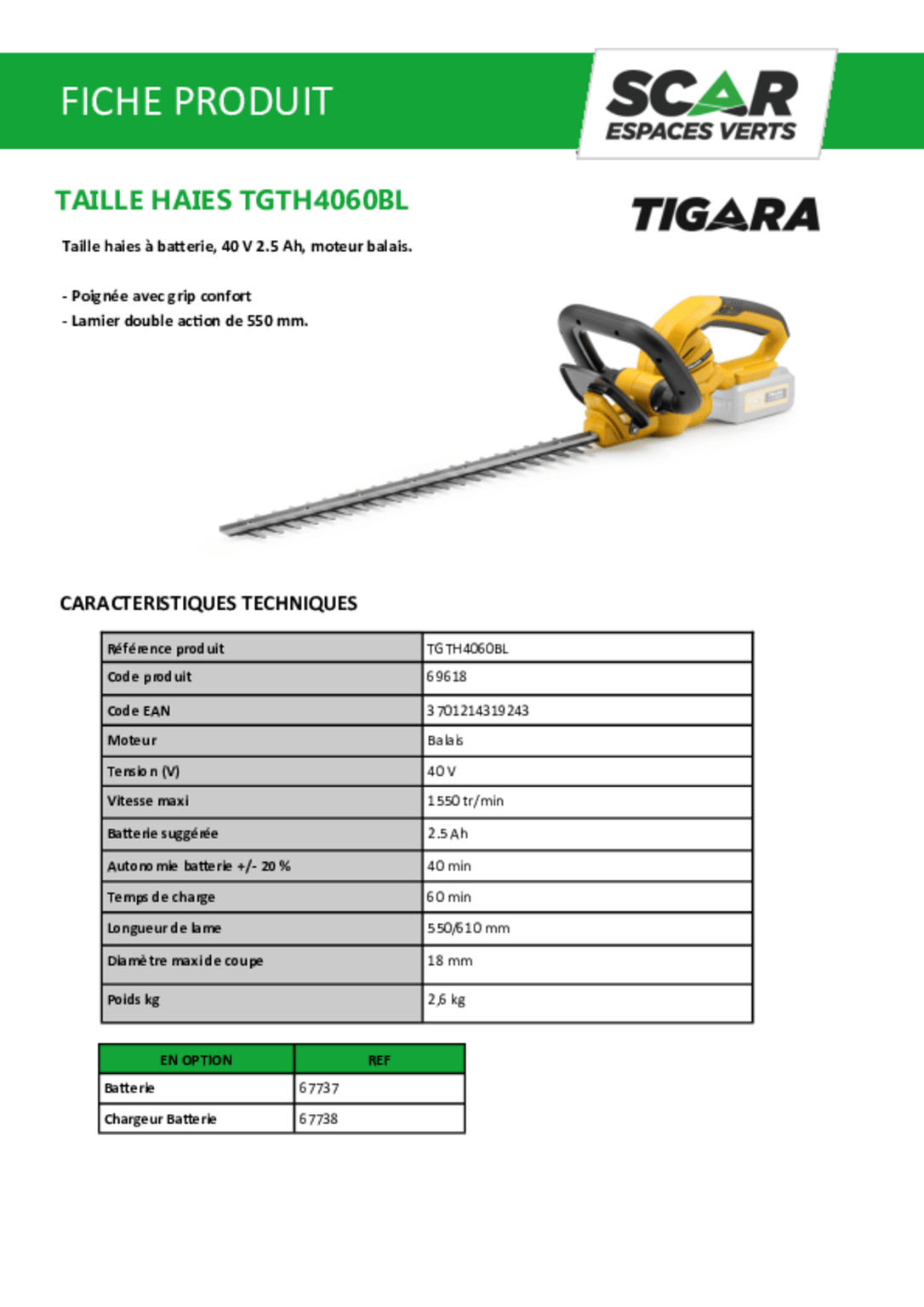 Taille haies TGTH4060BL avec chargeur et batterie . 40V 2,5 Ah. Autonomie moyenne : 40 min. Vitesse maxi : 1550tr/min. Type de lame : double. Longueur de lame : 550/610 mm. Espace entre les dents : 18 mm. Poignée grip. Poids : 2,6 Kg. Chargeur de batterie. 2,5Ah. Alimentation : 230V. Tension de charge : 40 V -50/60 Hz. Courant maxi : 1.8A. Batterie Lithium. Tension : 40 V. Capacité : 2,5 Ah. Dimensions : 145x85x75 mm.