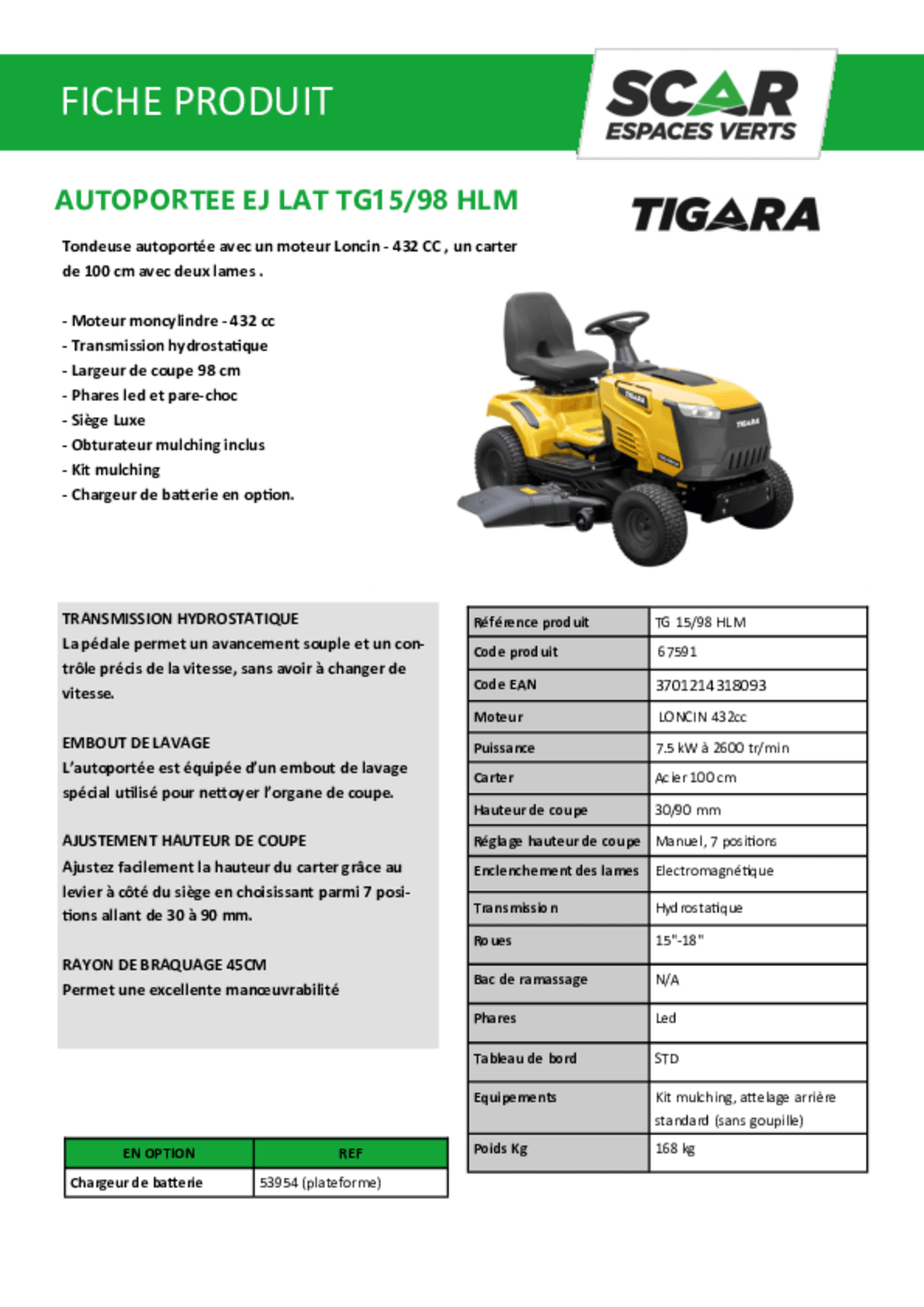 Tondeuse autoportée à éjection latérale TG 15/98 HLM