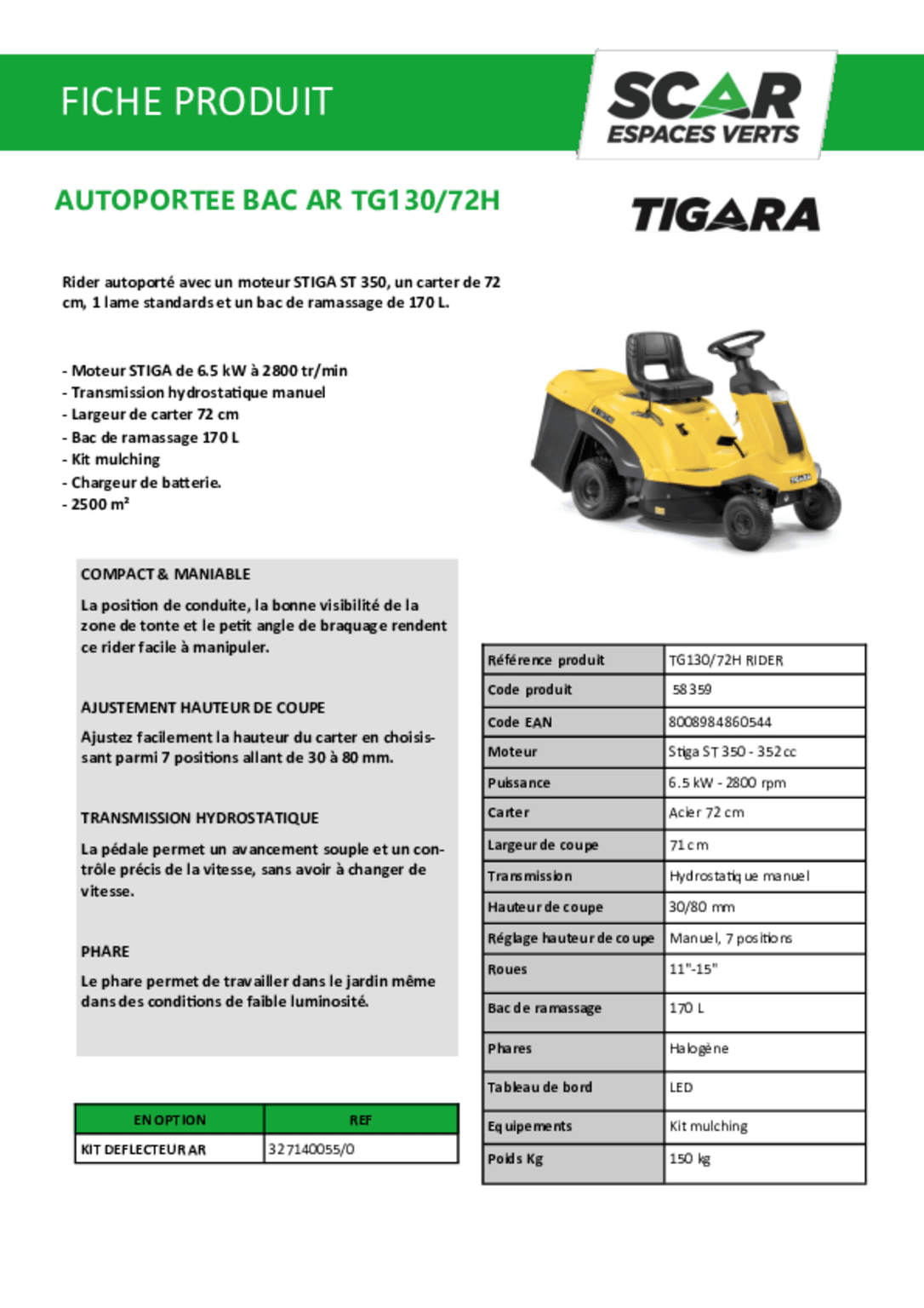 Tondeuse autoportée à éjection arrière TG 130/72H