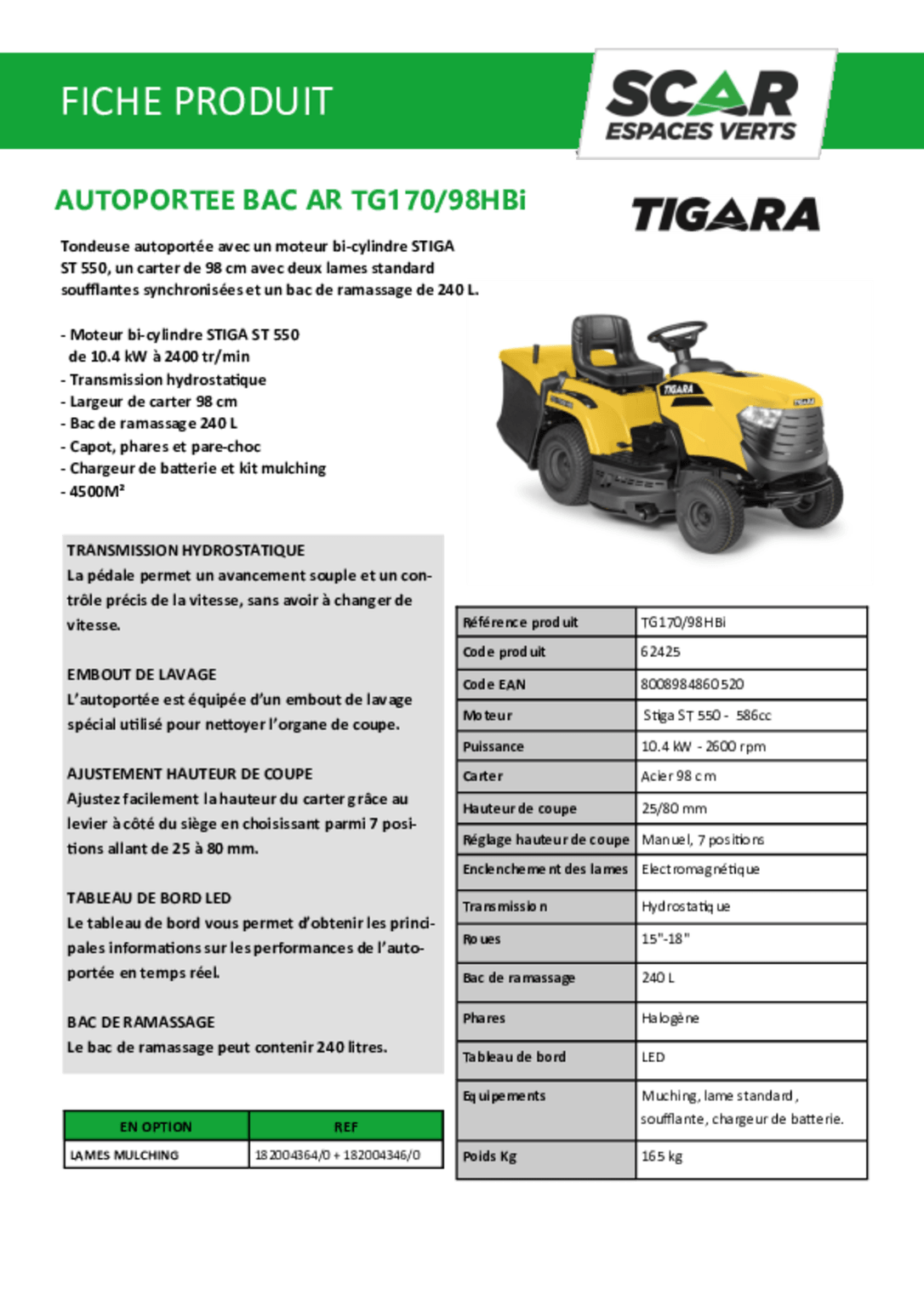 Tondeuse autoportée à éjection arrière TG 170/98 HBI