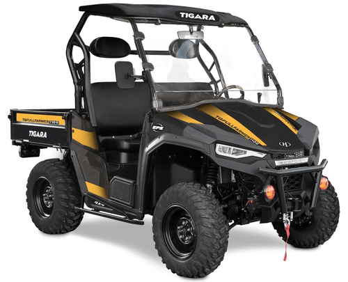 SSV. TG FULL FARMER. Moteur diesel KUBOTA. Cylindrée 1123 cc. 3 cylindres 4 temps. Alésage x course : 78 x 78,4 mm. Allumage électronique. Démarrage électrique. Système de refroidissement liquide. Carburant diesel. Capacité réservoir 35 L. Transmission : variateur automatique. Rapport long ou court + marche arrière. Mode 4x4 débrayable. Différentiel AR/AV. Transmission finale : cardan. Injection électronique. Direction assistée. 4 roues motrices. Bavettes de protection roues arrière. Benne basculante électrique. Treuil 1360 kg. Banquette 3 places. Attelage agricole avant et arrière. Pare brise en plexiglass. Homologué T1b route 3 places.