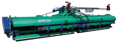 Broyeur adapté aux travaux polyvalents grâce à son rotor 6 rangées équipé de couteaux Y et de palettes de ventilation. Châssis surdimensionné et protecteurs de transmissions brevetés. Boîtier 280 cv avec roue libre incorporée. Equipé d'une paire de roues jumelées et d'une paire de roues simples (rouleau avec décrottoir Ø 245 mm en option). Existe en 2 largeurs : 4,80 et 6,40 m de largeur de travail. Repliage hydraulique. NOUVEAUTE : système de tapis d'andainage positionné dans le flux d'éjection du rotor. Entraînement hydraulique. Totalement démontable pour retrouver une utilisation conventionnelle. Permet d'effectuer un andain à l'extrémité du broyeur afin de récolter la végétation pour alimenter un méthaniseur. S'adapte sur les broyeurs déjà en service.