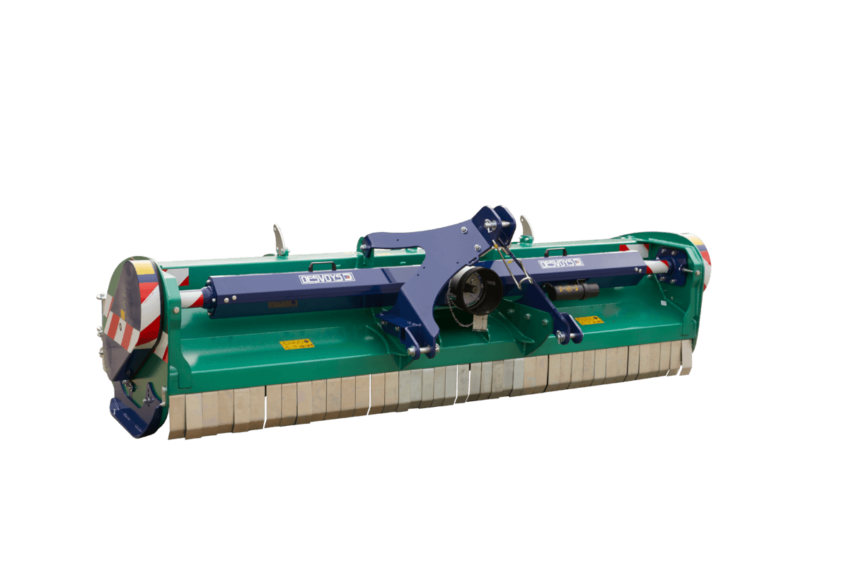 Largeur 3,20m. Caisse dotée de 3 poutres de fortes sections. Grand volume intérieur pour les végétations denses. Rotor de 244mm pour une grande rigidité et un diamètre de coupe de 685mm. Épaisseur de caisse de 4mm + une tôle de blindage de 4mm supplémentaire de série. À l’arrière, 2 roues semi-pivotantes ou un rouleau en option. Nombreux montages de couteaux dont le nouveau marteau B9 en option. Poids 1900 kg