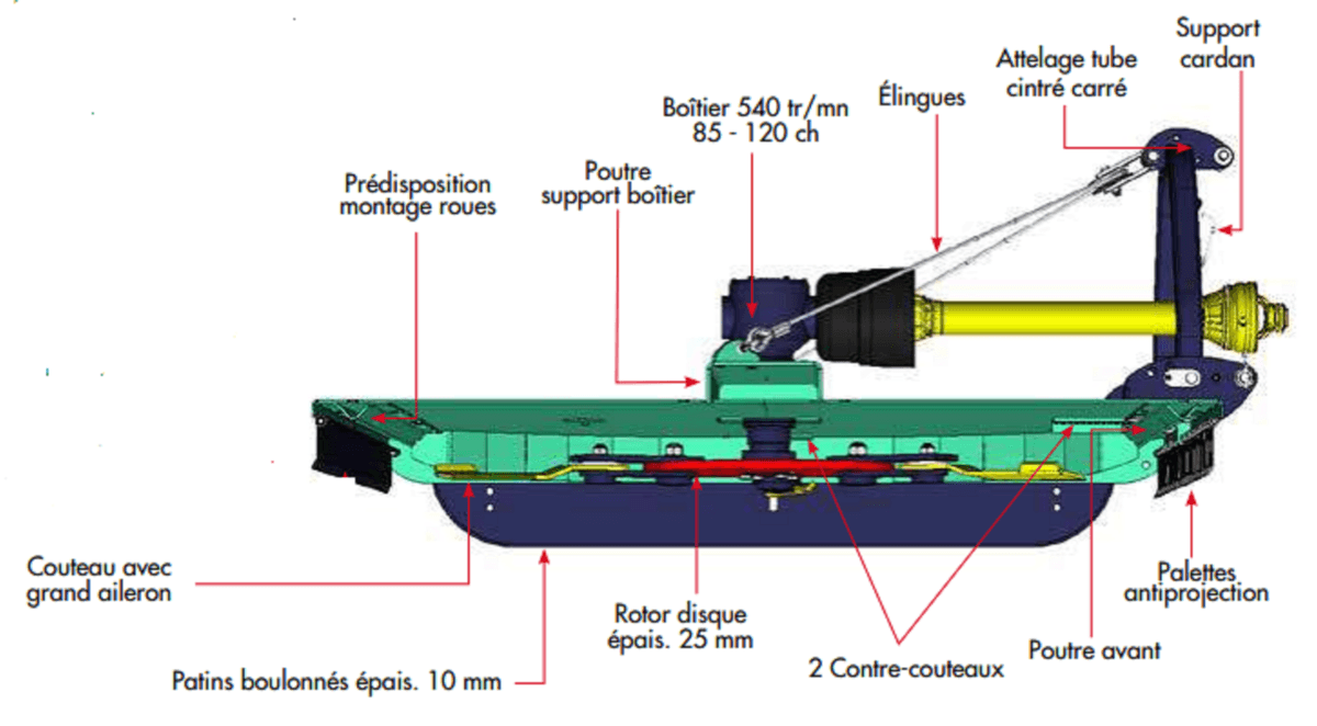 Le gyrobroyeur CLEAN COUPE idéal pour tous les entretiens de végétations avec caisse solide, grand dégagement. Rotor équipé de 3 lames sur biellettes d’articulation et grands ailerons et 2 contre couteaux. Attelage tube cintré carré sur chapes fixe ou déportable et dispositif flottant pour toutes sortes de terrains. Suivi au sol réglable : paire de patins boulonnés. Régime PDF : 540 tr/mn. Hauteur de coupe de 60 à 210 mm. Poids de 630 à 730 kg.