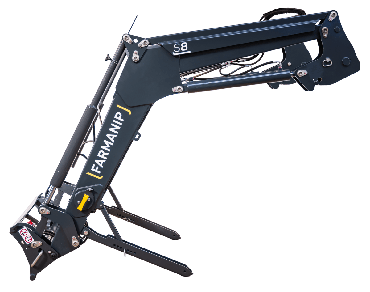 Chargeur S8. Compatible pour tracteurs de 80 à 130 cv. Hauteur de levée à l'axe de l'outil : 3,8m. Angle de cavage au sol: 49°. Angle de déversement à hauteur maxi: 55°. Charge utile à 0,80m de l'axe de rotation de l'outil (calculée avec un outil de 180 kg) : - au sol : 1650 kg. - à 2m du sol : 1700 kg. - à hauteur maxi : 1600 kg.