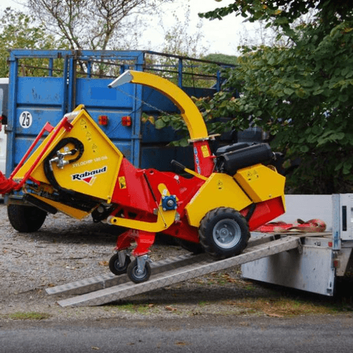 Broyeur à déplacement autotracté grâce aux 2 roues commandées hydrauliquement pour un diamètre de branche de 110 mm. Machine sécurisée : Barre de sécurité 4 positions et arrêt d'urgence avec bouton de réinitialisation.