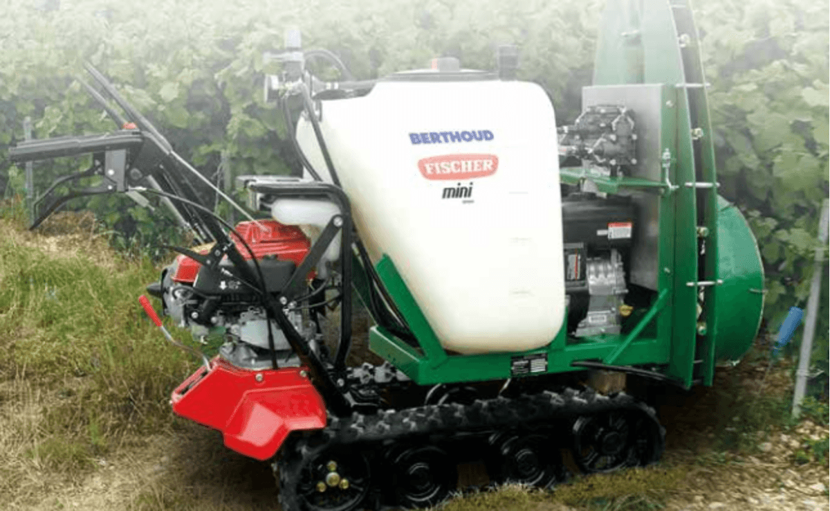 Une gamme de pulvérisateurs pour vigne, sur chenille composée de 3 modèles. Châssis zingué prévu pour adaptation sur chenillette. Moteur thermique essence de 6 ou 10 cv selon choix du modèle. Réservoir 125 L polyéthylène haute densité avec grand orifice. Régulation constante 2 ou 4 vannes de tronçon selon modèle et manomètre glycérine 0/25 bar ou 0/60 sur modèles MINI TRAC pour surveiller et régler la pression. Ventilation Airline 8 ou 10 sorties (MINI TRAC 500H). Pompe à 2 Pistons membranes 20L/min.
