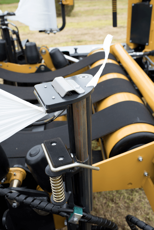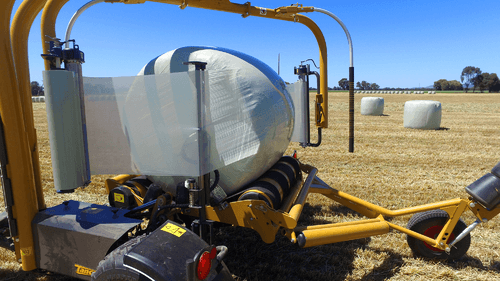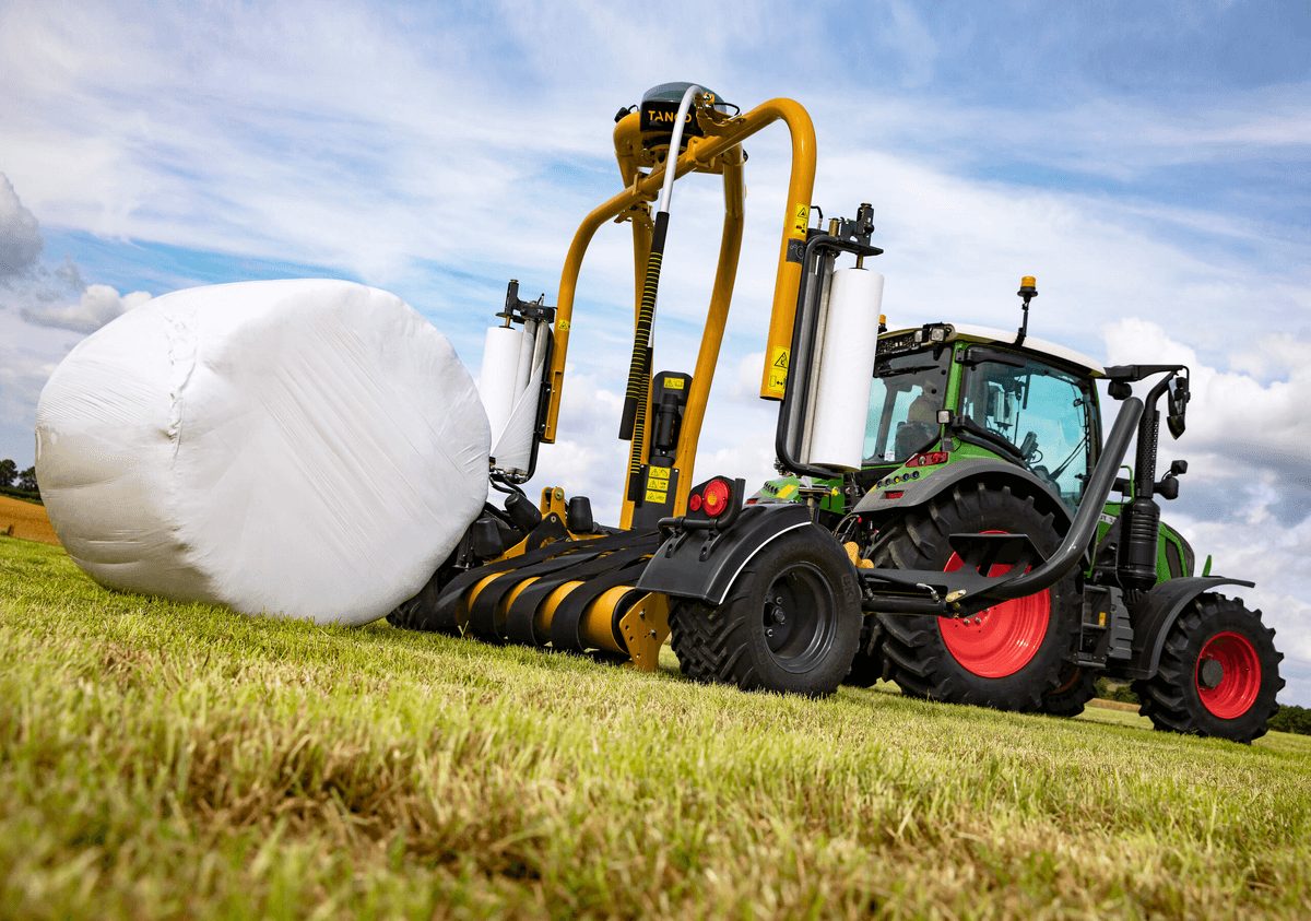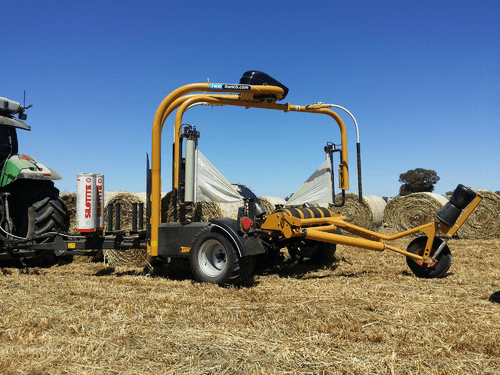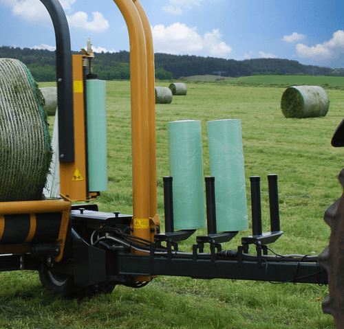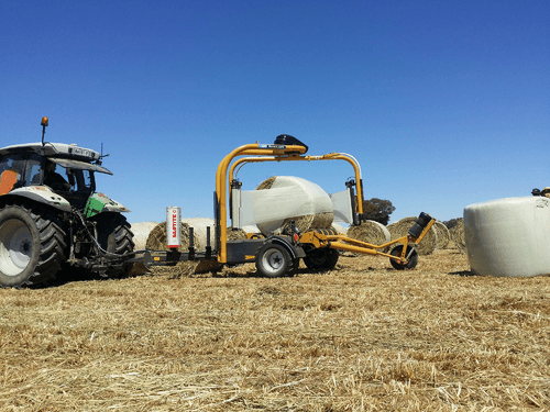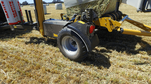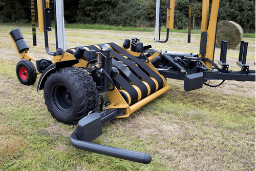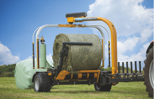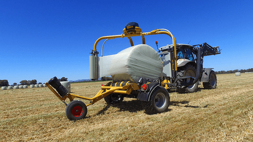 Enrubanneuse traînée double satellites, chargement dans le sens d'avancement de la presse. Table d'enrubannage fractionnée permettant un chargement et un déchargement simultanés de la balle. Ø de balle jusqu'à 1,5m et poids maxi 1 400kg.