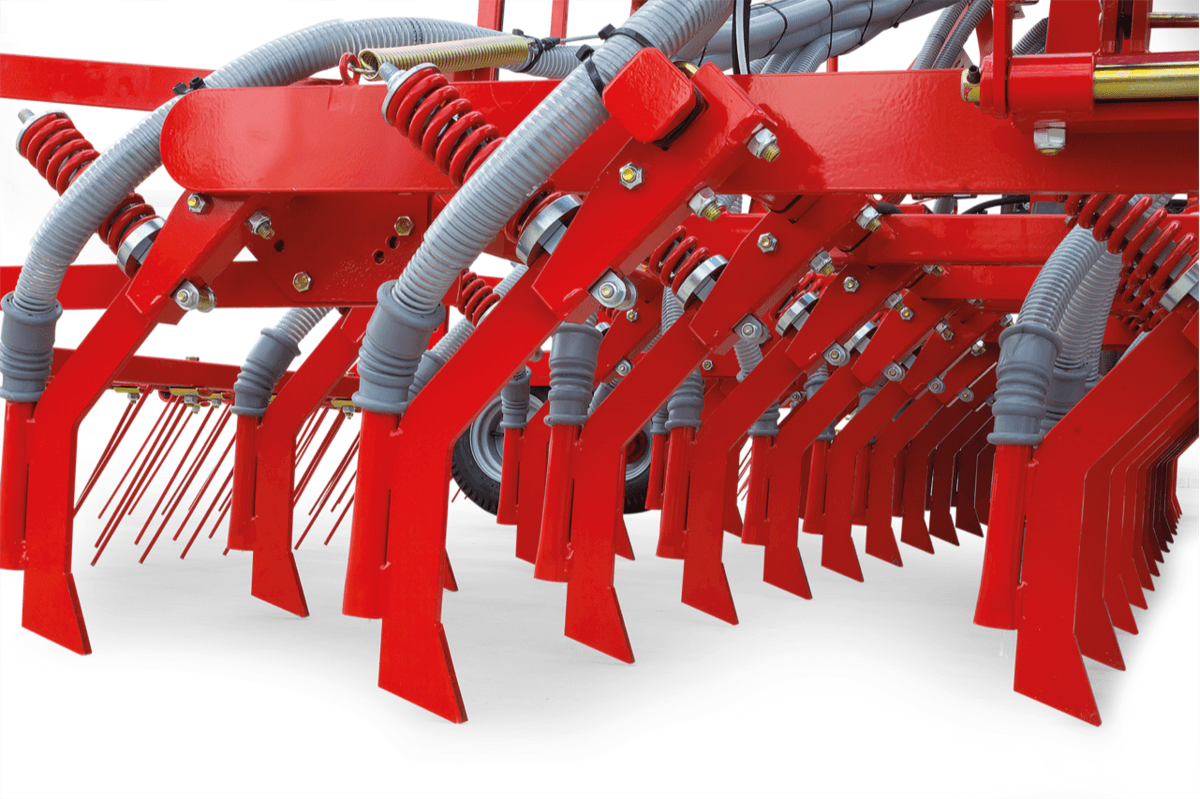 Distribution pneumatique avec doseur double cannelures toutes graines, dents fines 12mm carbure de tungstène, résistance 160kg, pour semis direct, TCS ou sur sol préparé, pour une précision de semis, une grande rapidité de chantier et d'économie d'implantation.