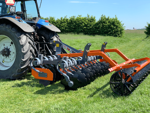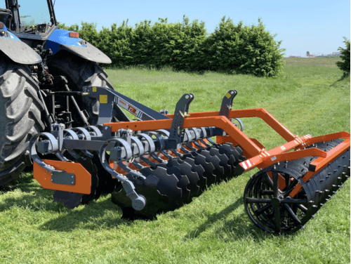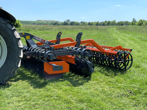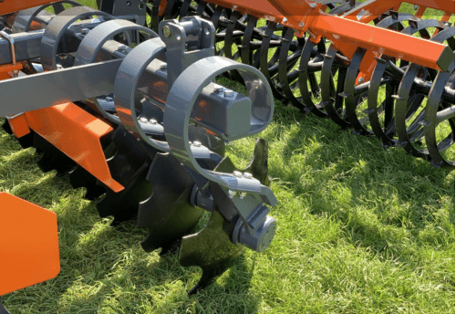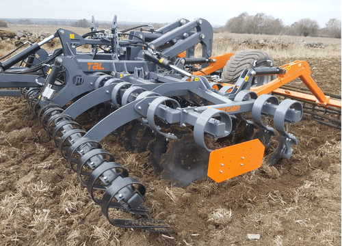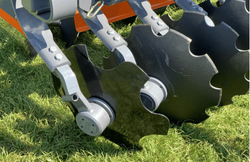 Déchaumeur à disques TAL-C qui fonctionne très bien sur sol pierreux. Avec ces disques crénelés de 560 mm de diamètre en acier fixés au palier sans entretien. Ressort amortisseur de taille 100x13 mm.