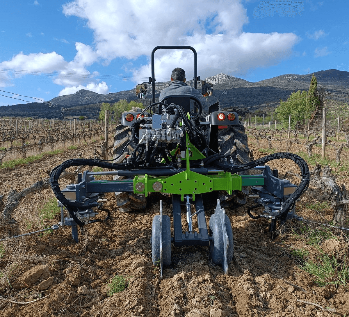 Châssis polyvalent avec système automatique d’auto-centrage. Nombreux outils interchangeables : lames, tondeuses, fraises, socs… Pour vignobles d’1,80 à 4m d'inter-rangs.