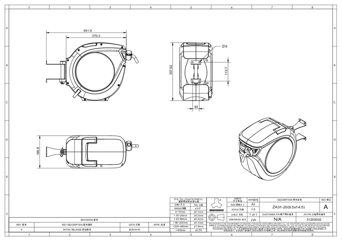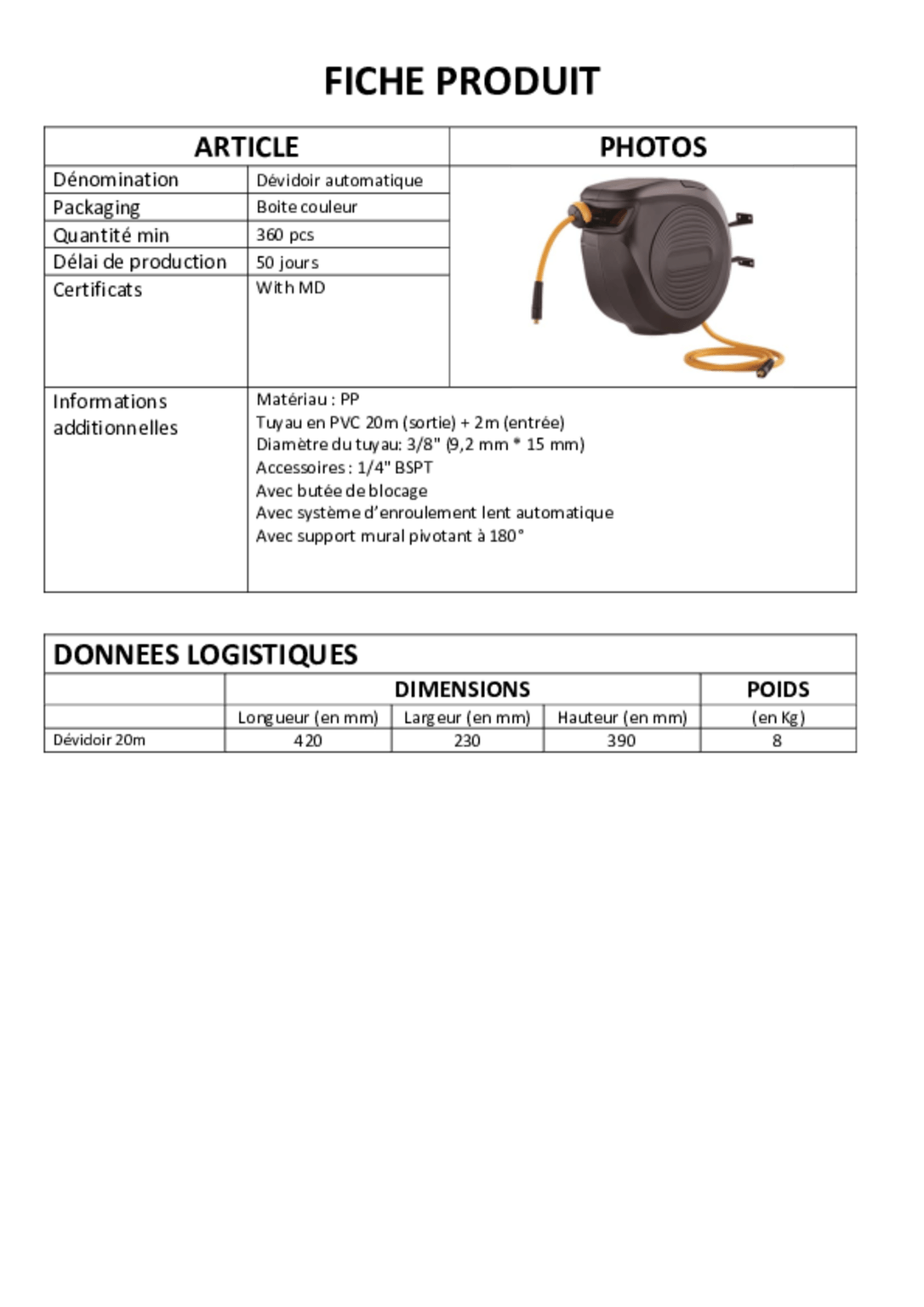 Enrouleur de tuyau d'air automatique. Tuyau PVC, Longueur : 20 m (sortie) + 2m (entrée). Diamètre : 9/15 mm. Accessoires : 1/4''BSPT. Enrouleur en PP/Acier. Support de montage pivotant à 180°. Mécanisme de verrouillage Stop-anywhere. Rétraction sécurisée à faible dépense. Guide-tuyau rétractable automatique. Bille d'arrêt réglable sans outils. Poids : 8 kg. Garantie : 1 an.