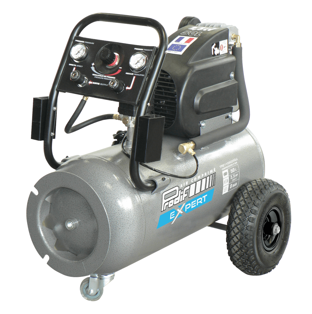 Sans huile. 6 L. Débit restitué : 61 L/min, 8 Bar. Moteur bicylindre S1, 0,75 CV. 220 V.