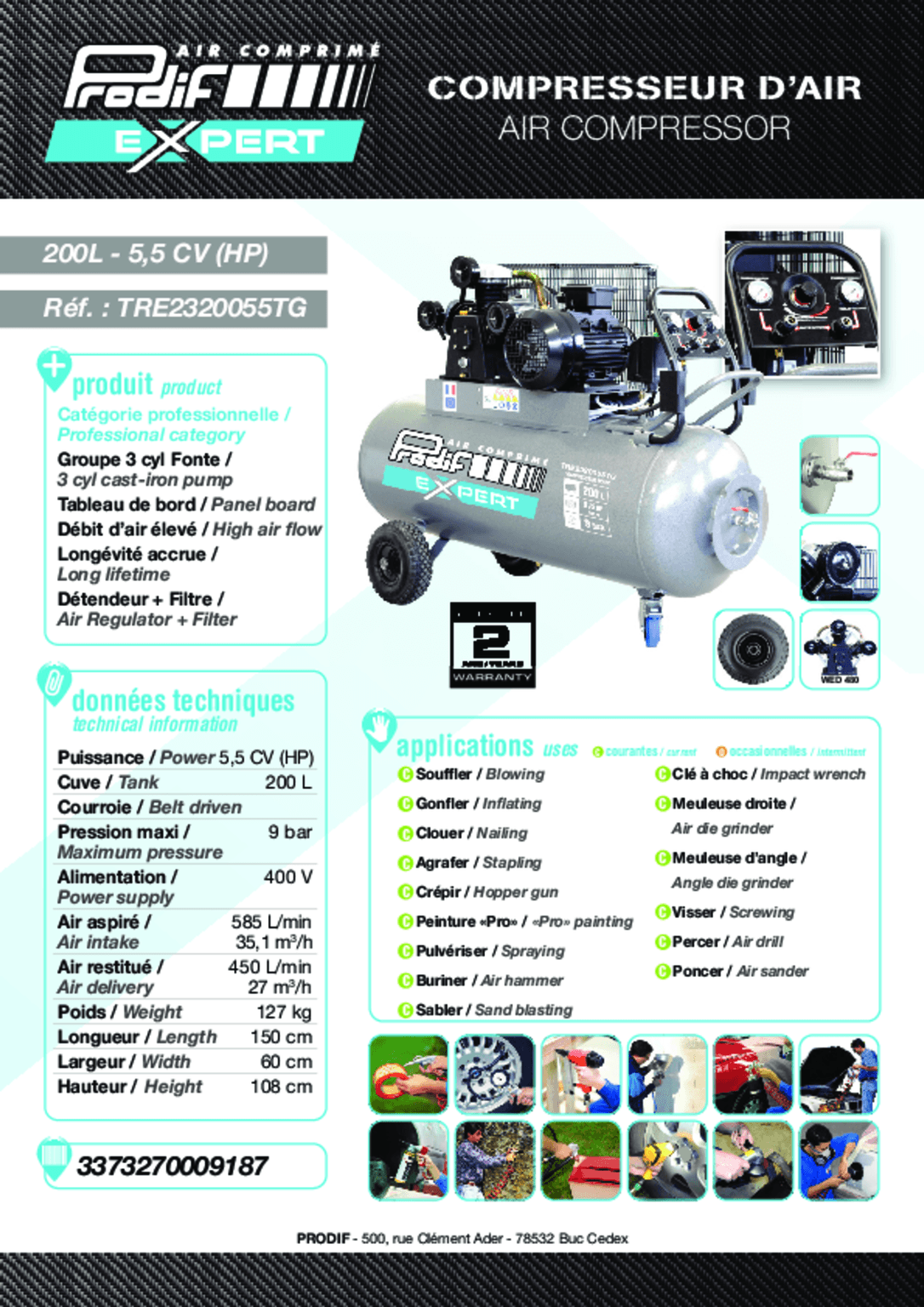 Débit aspiré : 585 L/min, débit restitué : 450 L/min, 9 Bar.