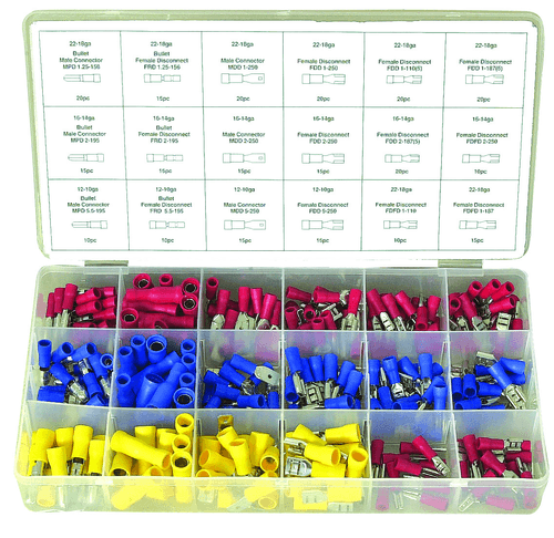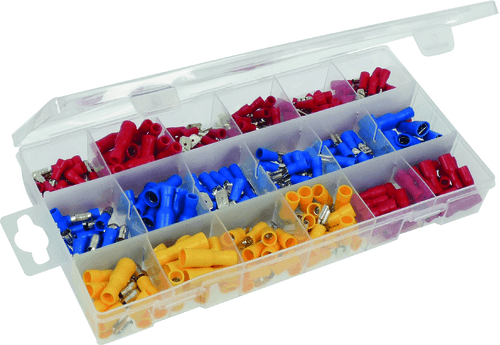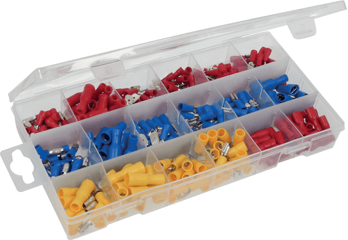 Coffret plastique de 280 cosses électriques assorties. Simple sertissage. 140 cosses pour fil électrique de 0,25 à 1 mm² : 35 rondes, 105 plates. 90 cosses pour fil électrique de 1 à 2,5 mm : 30 rondes, 60 plates. 50 cosses pour fil électrique de 2,35 à 6 mm² : 20 rondes, 30 plates.