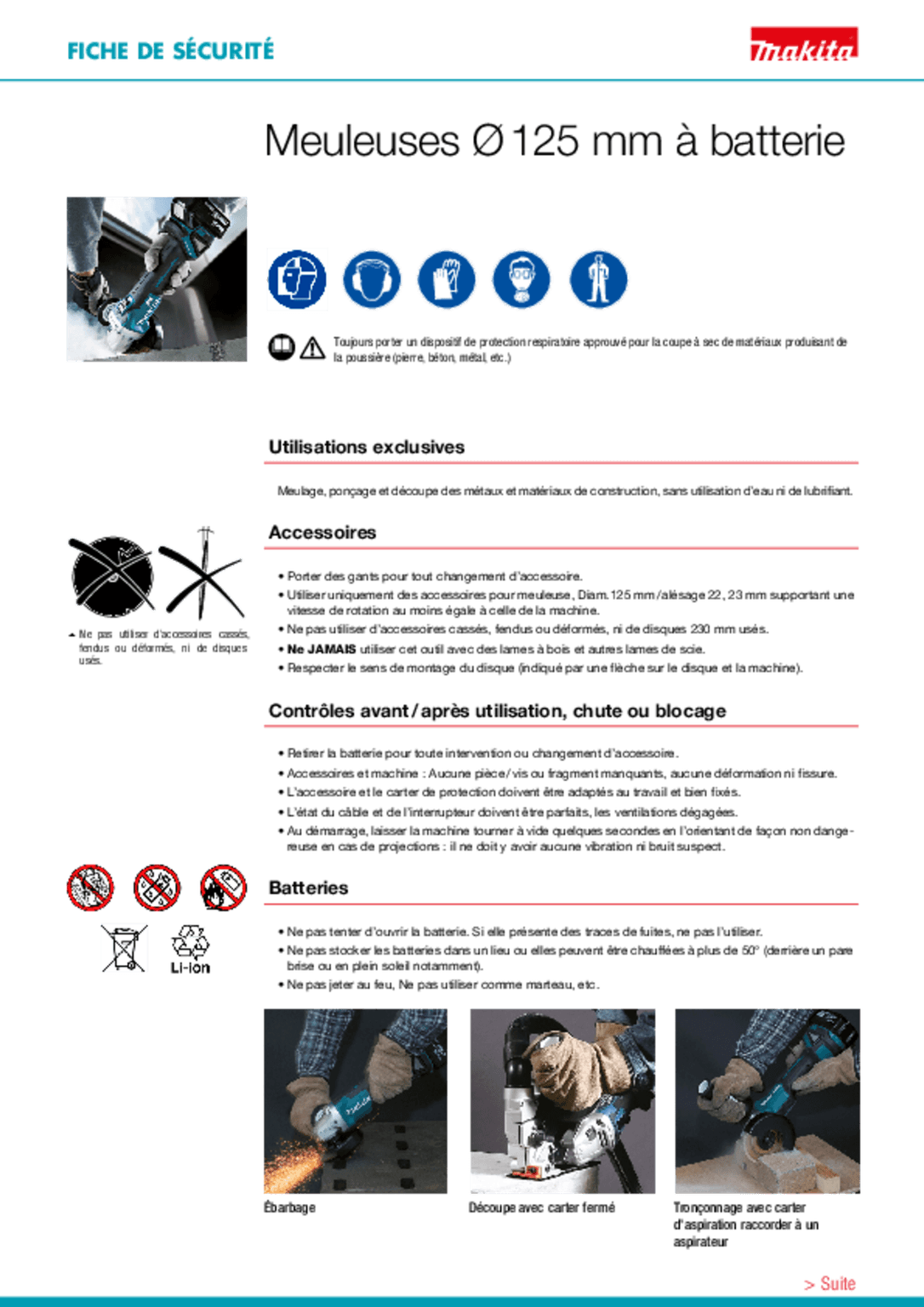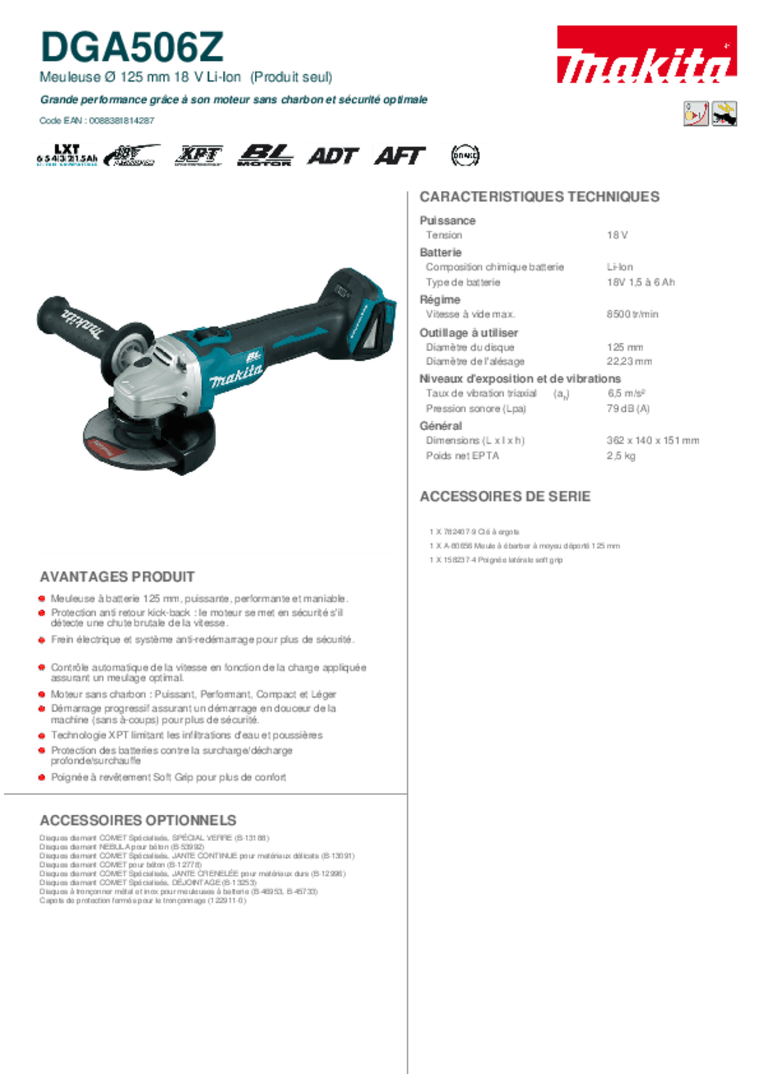 Diamètre disque : 125 mm. Diamètre alésage : 22,23 mm. Régime à vide : 8500 tr/min. Protection anti retour kick-back : le moteur se met en sécurité s'il détecte une chute brutale de la vitesse. Frein électrique et système anti-redémarrage pour plus de sécurité. Poignée à revêtement Soft Grip pour plus de confort. Livrée avec : -clé à ergots. -meule à ébarder à moyeu déporté 125 mm. Livrée sans batterie.