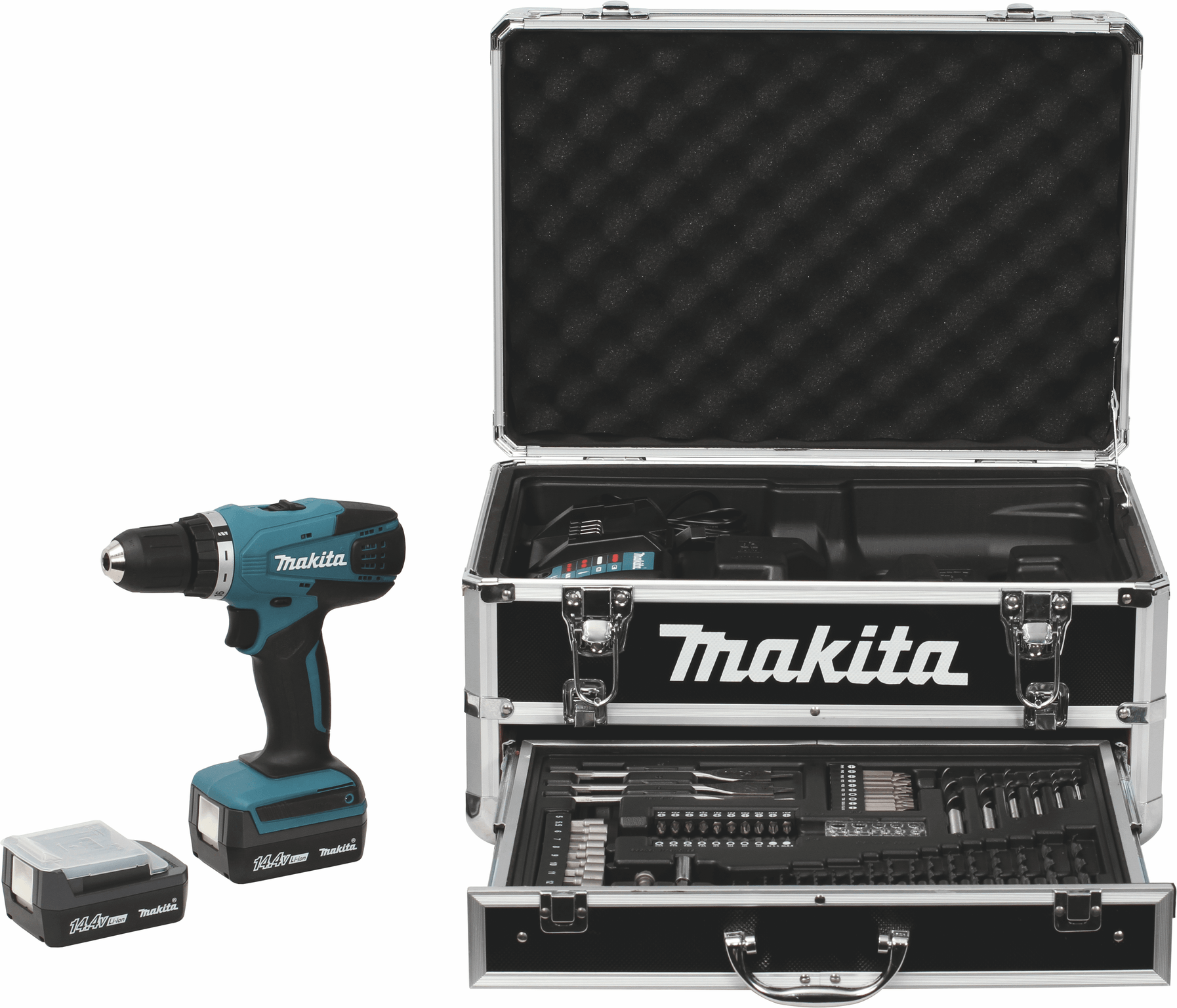 Perceuse-visseuse sans fil DF347DWEX3 + 70 accessoires. En coffret. Régime à vide : 0 à 400 tr/min, 0 à 1400 tr/min. Couple de serrage maxi (élast.) : 15 Nm. Couple de serrage maxi (franc) : 30 Nm. Couple réglable sur 16 positions. Capacité : acier : 10 mm, bois : 25 mm, diamètre vis mécanique : 6 mm, vis bois : 5,1x63 mm. 2 batteries 1,3 AH Li-ion, 14,4 V fournies. Mandrin autoserrant : 10 mm. Poignée fine et confortable. Frein électrique.