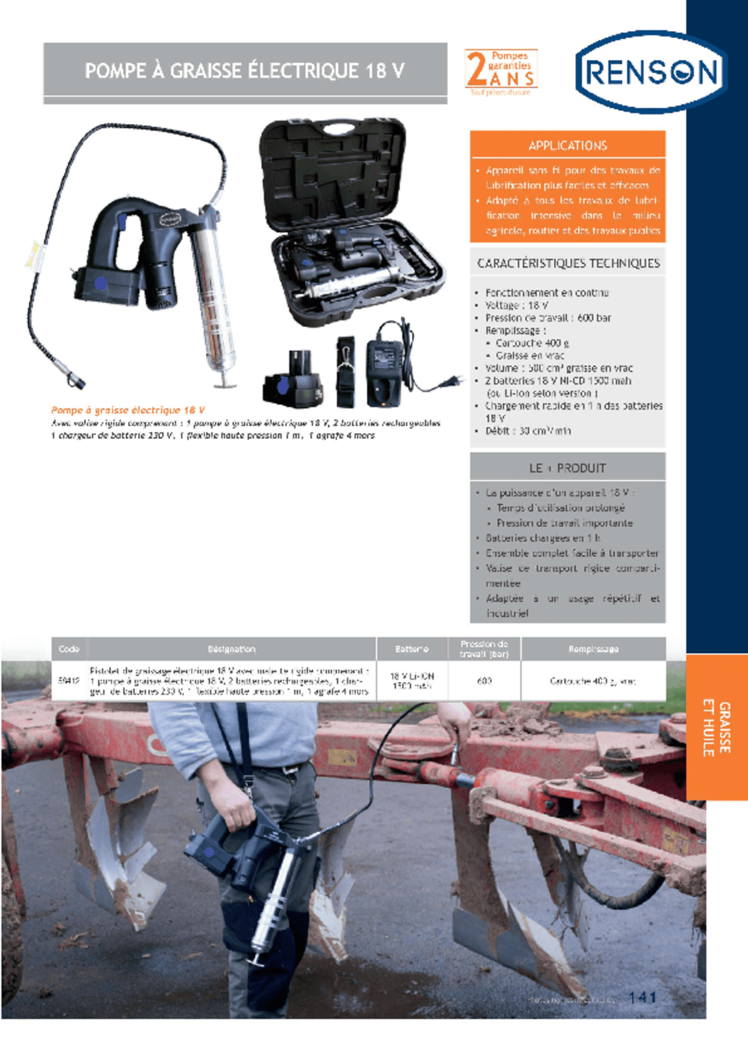 2 batteries 18 V Li-ion rechargeables, 1 chargeur de batteries 230 V, 1 flexible haute pression 1 m, 1 agrafe 4 mors. Pression de travail : 600 Bar. Remplissage : cartouche 400 g, graisse en vrac. Vendu avec coffret.