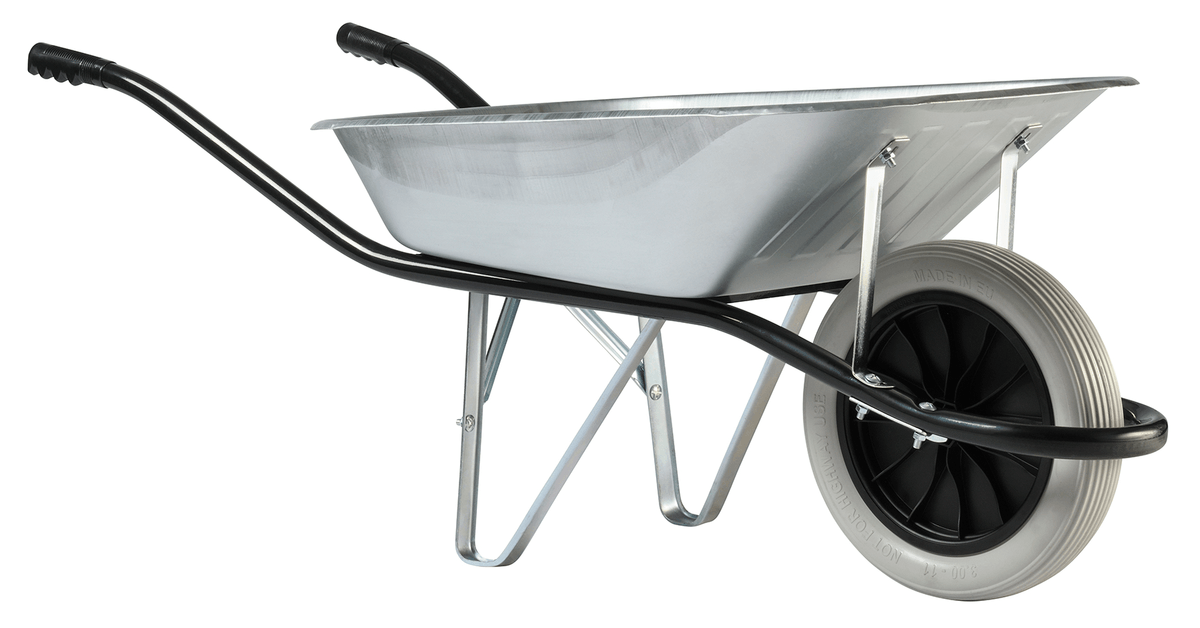 Caisse galvanisée, traitée anti-corrosion. Chassis peint. Idéal pour les travaux légers de bricolage et de chantier. Capacité : 90 L. Epaisseur : 0,85 mm. Châssis : pieds boulonnés tube, diamètre : 32 mm formant un butoir. Avec supports caisse. Roue gonflée, diamètre : 380 mm. Jante métal à rayons. Fixation par coussinets fonte. Dimensions totales : 1380x655x547 mm. Charge utile 120 kg.