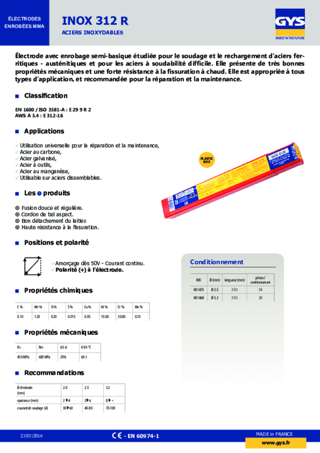 316L. A enrobage rutilo-basique à très basse teneur en carbone. Ø 2,5 x 300 x 30.
