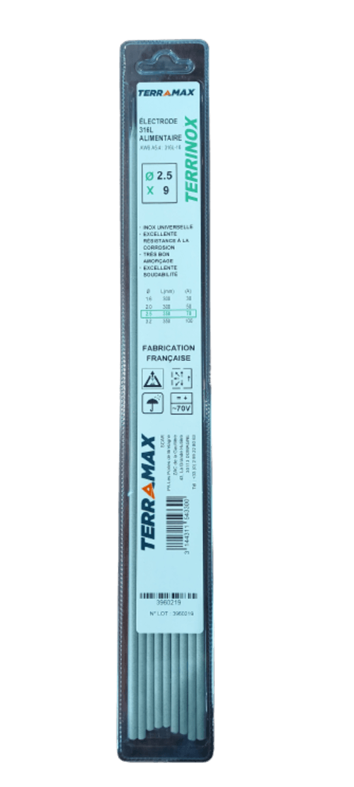 316L. A enrobage rutilo-basique à très basse teneur en carbone. Ø 2,5 x 300 x 30.